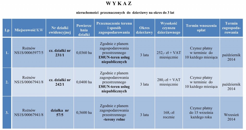Wykaz nieruchomości przeznaczonych do dzierżawy na okres do 3 lat