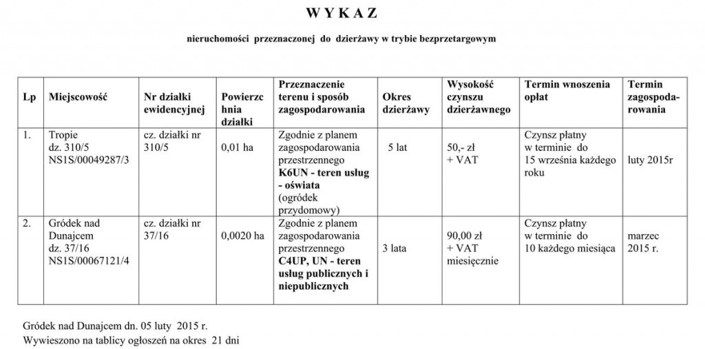 Wójt Gminy Gródek nad Dunajcem podaje do publicznej wiadomości wykaz nieruchomości przeznaczonych do dzierżawy w trybie bezprzetargowym