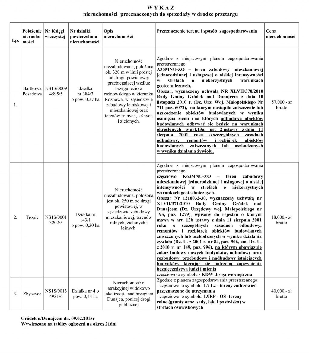Wójt Gminy Gródek nad Dunajcem podaje do publicznej wykaz nieruchomości przeznaczonych do sprzedaży w drodze przetargu.