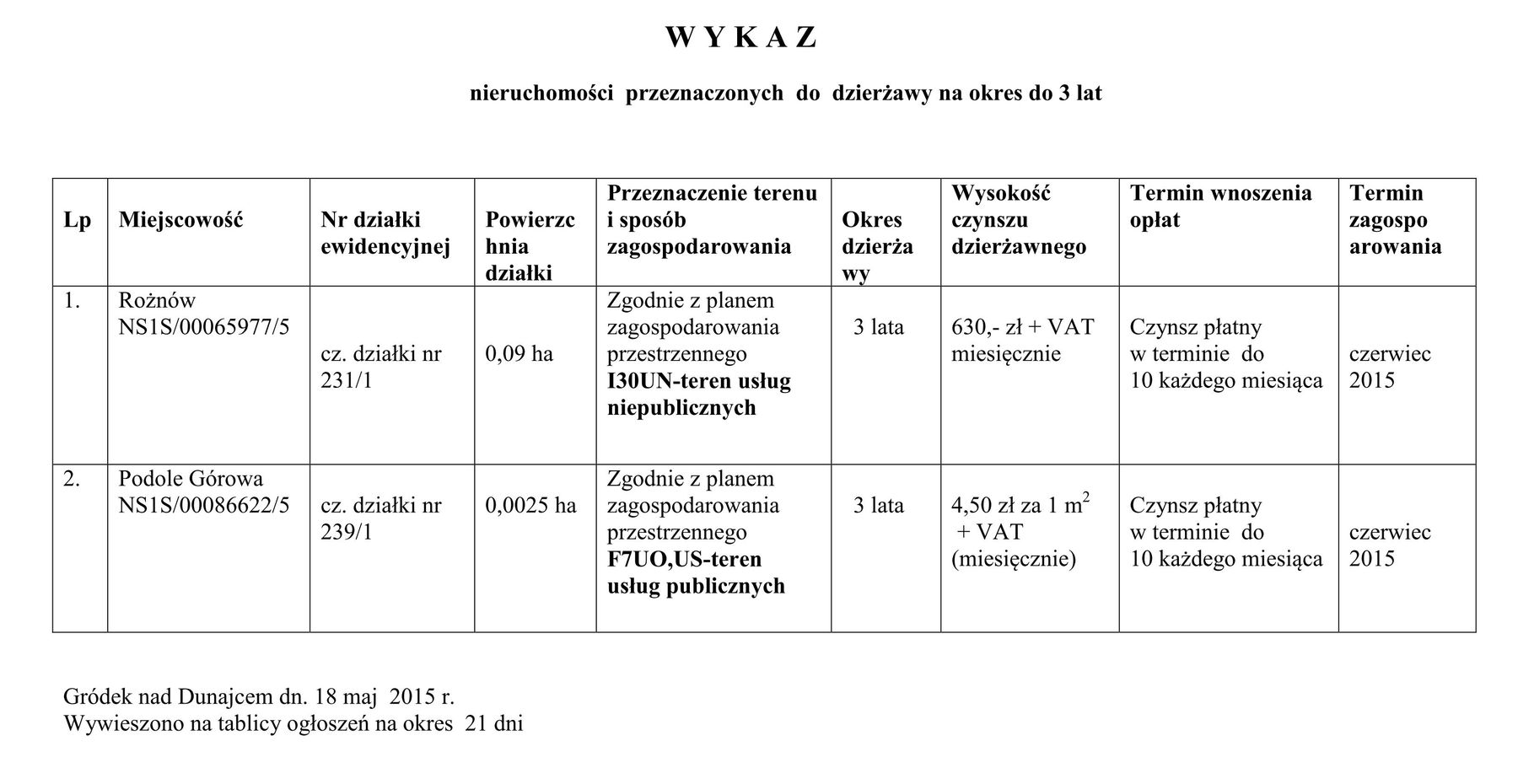 Wójt Gminy Gródek nad Dunajcem podaje do publicznej wiadomości wykaz nieruchomości przeznaczonych do dzierżawy na okres do 3 lat.