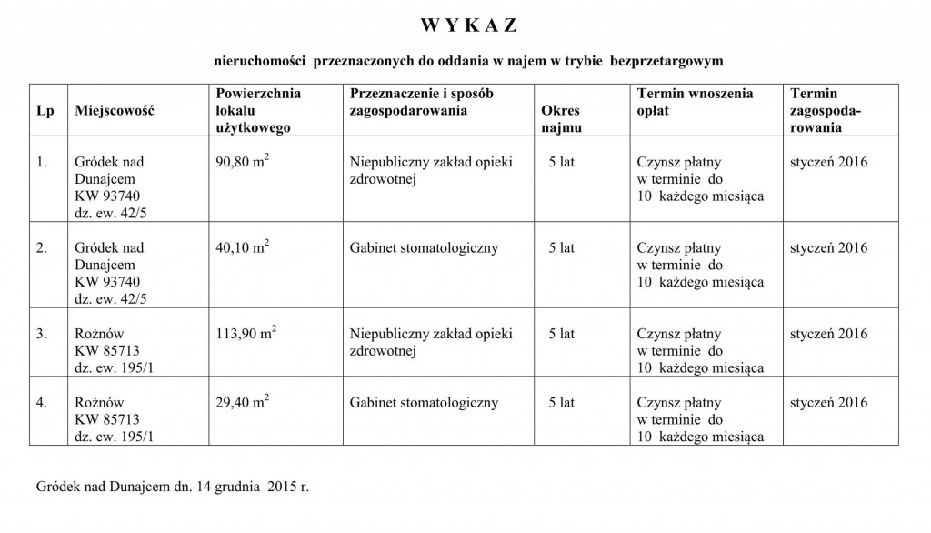 Wójt Gminy Gródek nad Dunajcem podaje do publicznej wiadomości wykaz nieruchomości przeznaczonych do dzierżawy w trybie bezprzetargowym.