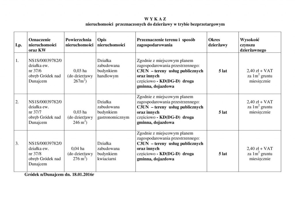 Wójt Gminy Gródek nad Dunajcem podaje do publicznej wiadomości wykaz nieruchomości przeznaczonych do dzierżawy w trybie bezprzetargowym