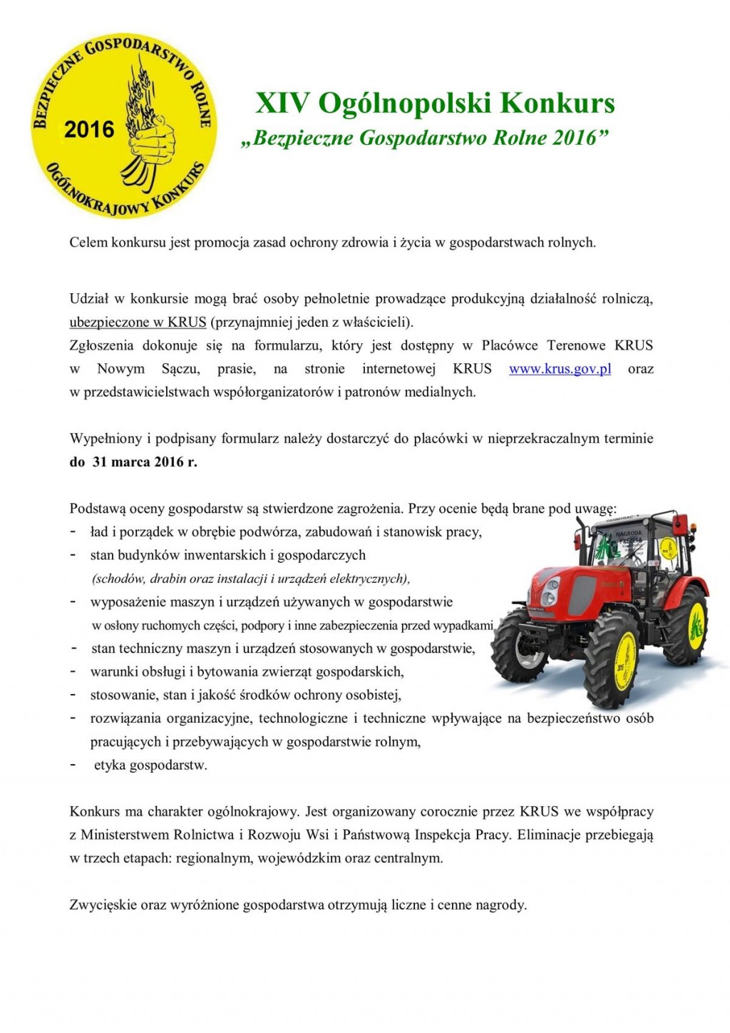 KRUS we współpracy z Ministerstwem Rolnictwa i Rozwoju Wsi i Państwową Inspekcję Pracy organizują coroczny konkurs "Bezpieczne Gospodarstwo Rolne 2016". Celem konkursu jest promocja zasad ochrony zdrowia i życia w gospodarstwach rolnych.