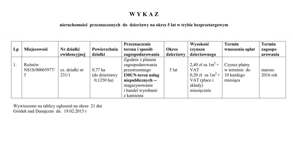 Wójt Gminy Gródek nad Dunajcem podaje do publicznej wiadomości wykaz nieruchomości przeznaczonych do dzierżawy na okres 5 lat w trybie bezprzetargowym