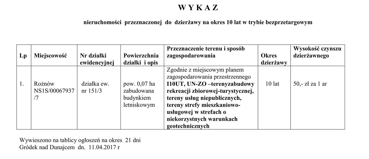Wójt Gminy Gródek nad Dunajcem podaje do publicznej wiadomości wykaz nieruchomości przeznaczonej do dzierżawy na okres 10 lat w trybie bezprzetargowym.
