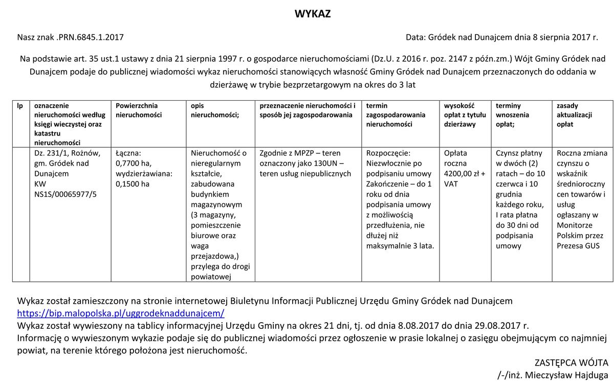 Wójt Gminy Gródek nad Dunajcem podaje do publicznej wiadomości wykaz nieruchomości przeznaczonej do dzierżawy w trybie bezprzetargowym na okres do 3 lat