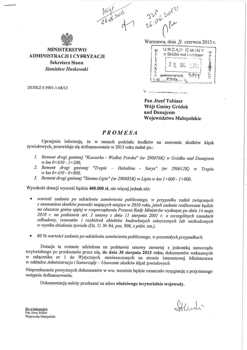 Otrzymana właśnie promesa na kwotę 400 tys. zł zostanie wykorzystana na remont trzech odcinków dróg: