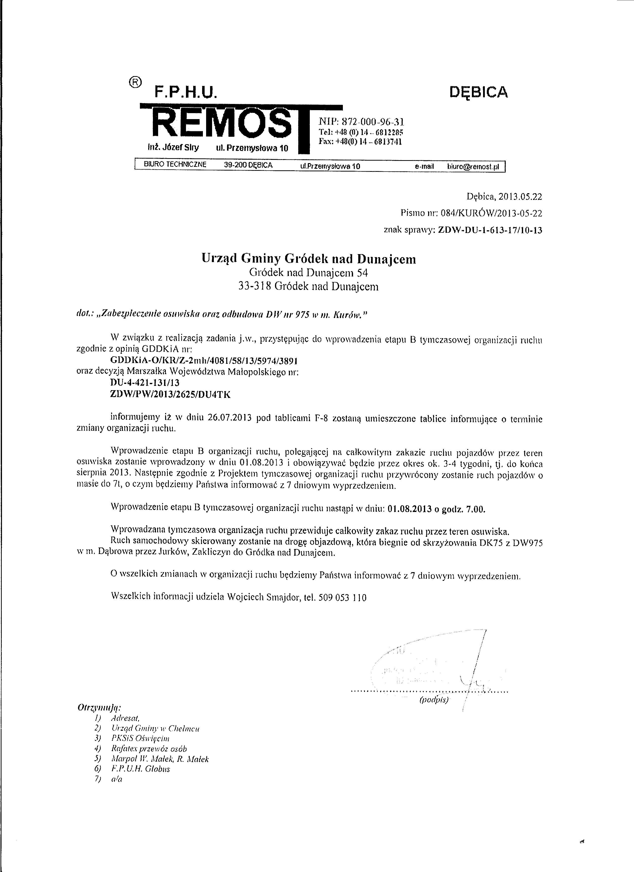 Zgodnie z informacją od Wykonawcy robót związanych z "Zabezpieczeniem osuwiska oraz odbudowa DW nr 975 w m. Kurów" od 1 sierpnia zostanie wprowadzony Etap B tymczasowej organizacji ruchu, który przewiduje całkowity zakaz ruchu przez teren osuwiska. Ruch samochodowy zostanie skierowany na drogę objazdową, która biegnie od skrzyżowania DK75 z DW 975 w m. Dąbrowa przez Jurków, Zakliczyn do Gródka nad Dunajcem.