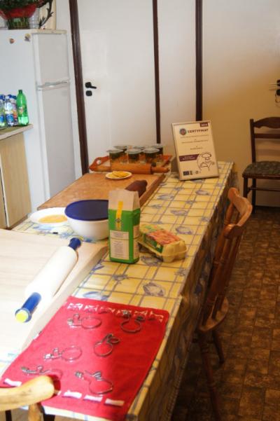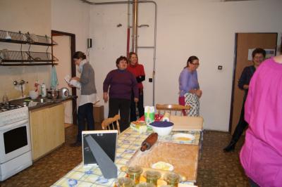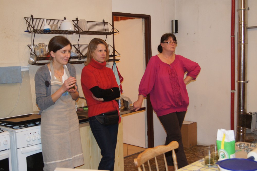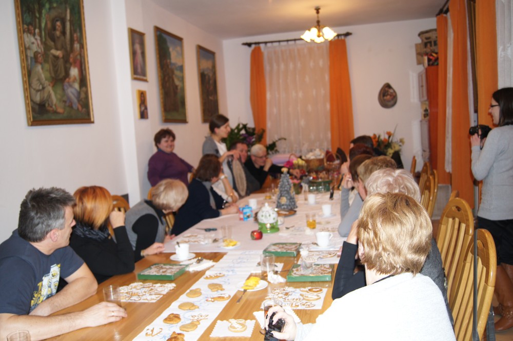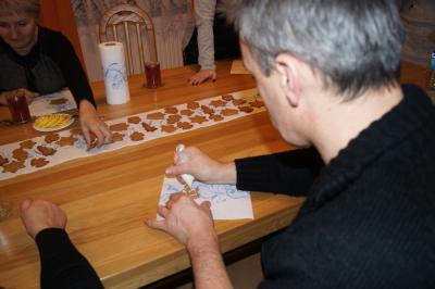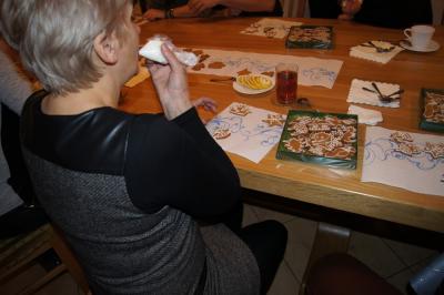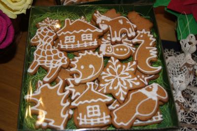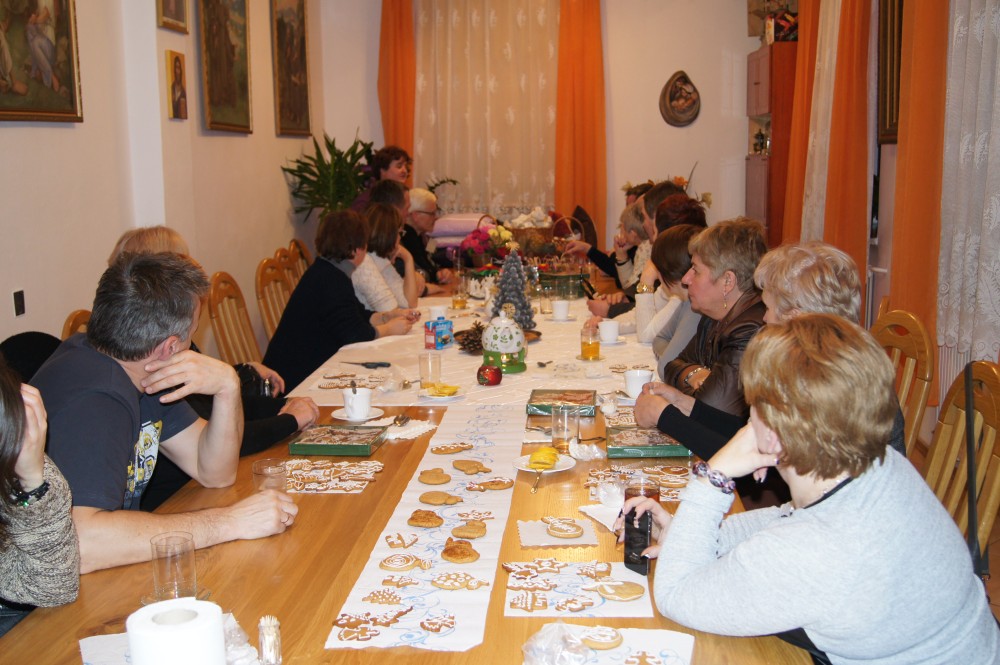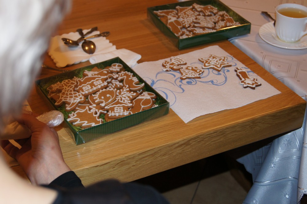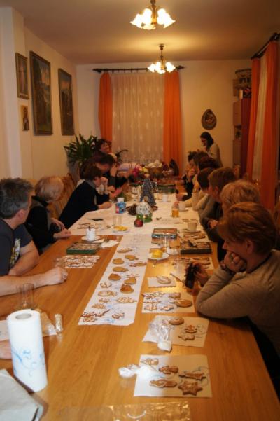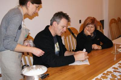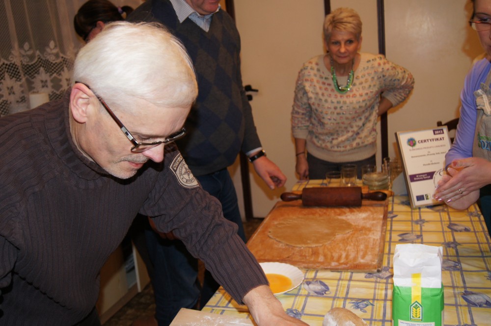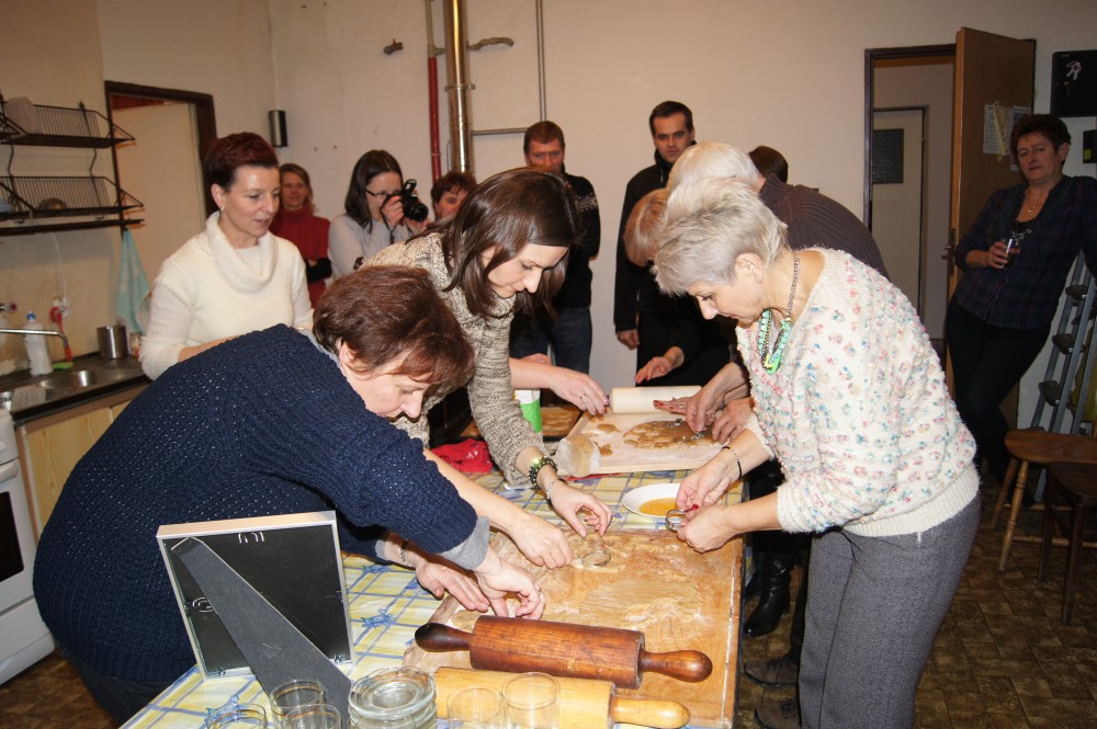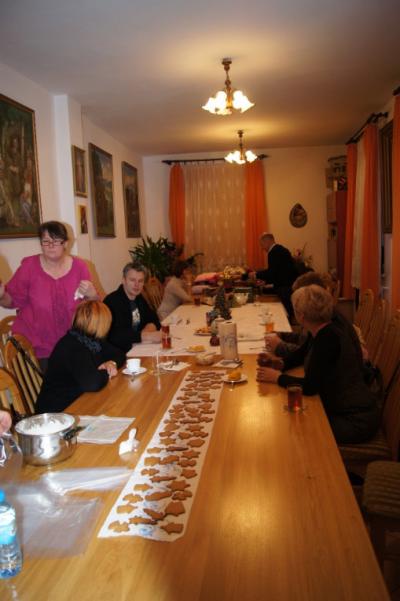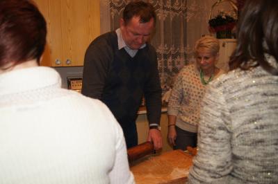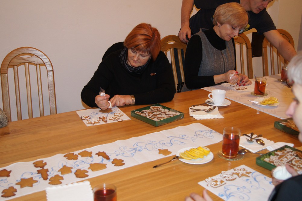 Zaproszeni gości uczestniczyli między innymi w tradycyjnych warsztatach wypieku i lukrowania pierników śliwkowych, które są produktem certyfikowanym. Dzięki uprzejmości i gościnności Księdza Proboszcza Andrzeja Piórka warsztaty mogły odbyć się w plebańskiej kuchni. Uczestnicy warsztatów z chęcią zabrali się do pracy przy zagniataniu, wałkowaniu i wycinaniu kształtów śliwkowych pierników. W tym samym czasie druga grupa dekorowała naturalnym i tradycyjnie wykonanym lukrem wcześniej upieczone pierniki. I tu odezwały się w uczestnikach zdolności artystyczne i ukryte talenty… artystycznym wariacjom nie było końca, a wszystko to przy gorącej ziołowej herbatce…