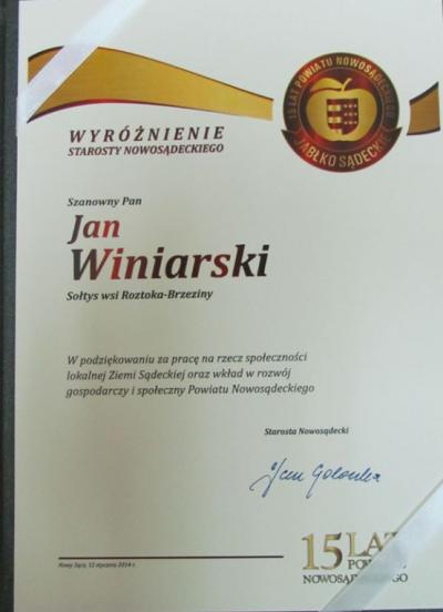 Jan Winiarski – sołtys wsi Roztoki-Brzeziny został uhonorowany przez Starostę Nowosądeckiego „Złotym Jabłkiem Sądeckim”. Okazją do wręczenia wyróżnienia był coroczny opłatek dla sołtysów zorganizowany przez Stowarzyszenie Sołtysów Ziemi Sądeckiej.
