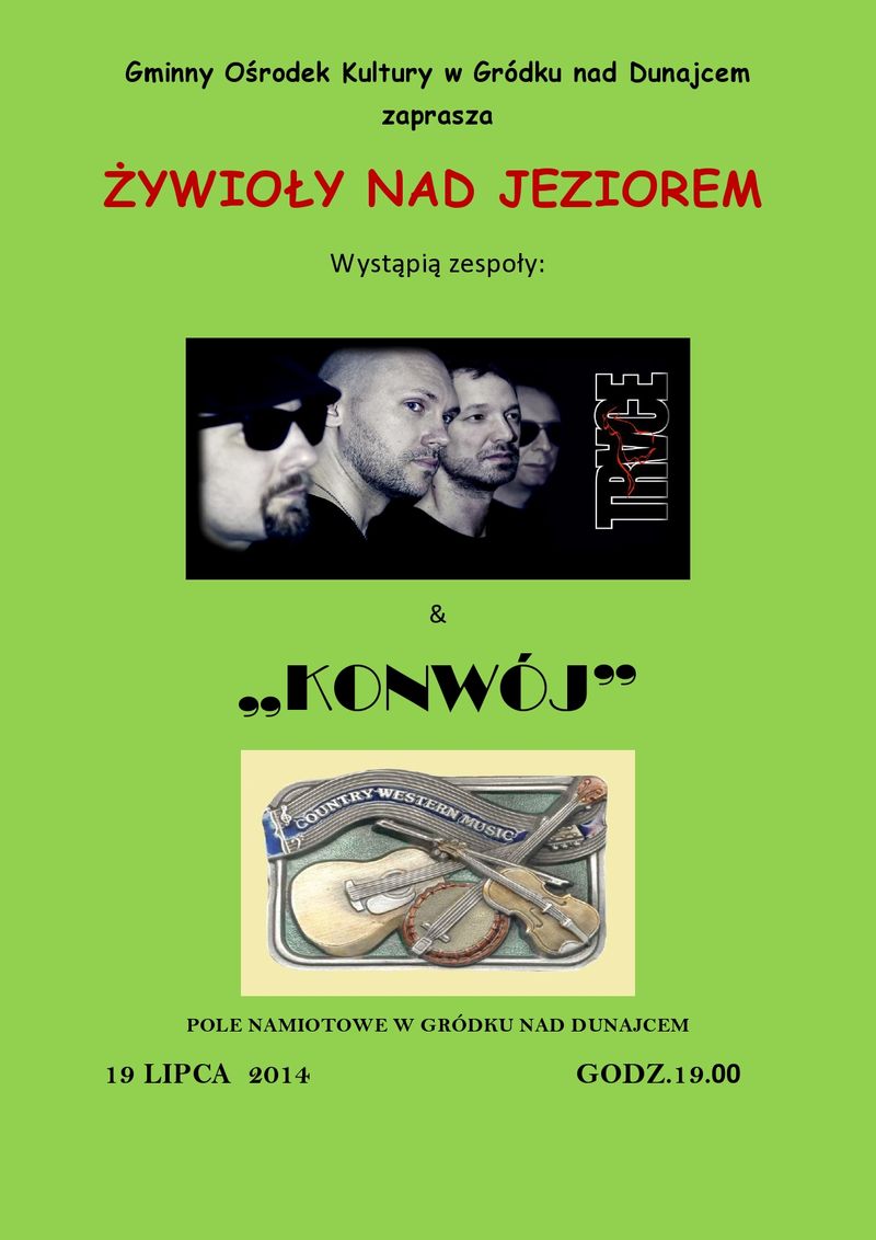 Gminny Ośrodek Kultury zaprasza w sobotę 19 lipca na pole namiotowe w Gródku nad Dunajcem na występ zespołów "TRACE" oraz "KONWÓJ". Początek imprezy o godz. 19:00. Zapraszamy!