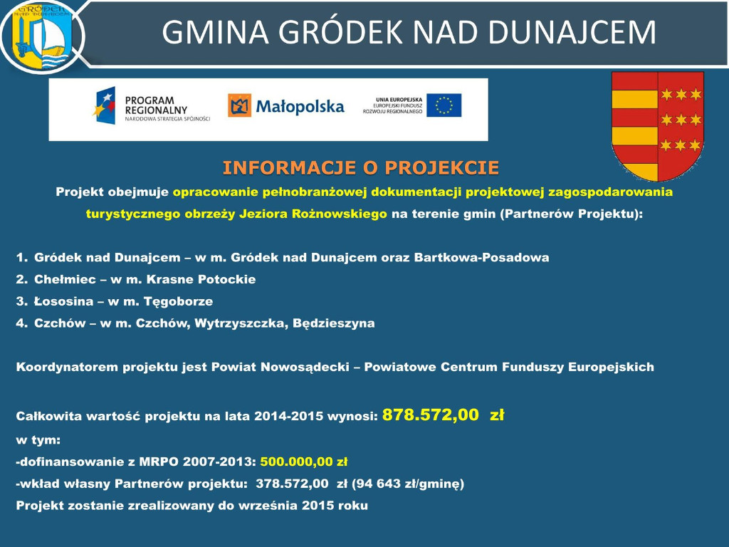 Na wniosek Wójta Józefa Tobiasza, liderem projektu został Powiat Nowosądecki, ponieważ zakres prac projektowych ma obejmować cztery gminy położone nad Jeziorem Rożnowskim czyli poza Gródkiem nad Dunajcem partnerem projektu zostały gminy: Chełmiec, Łososina Dolna oraz Czchów.