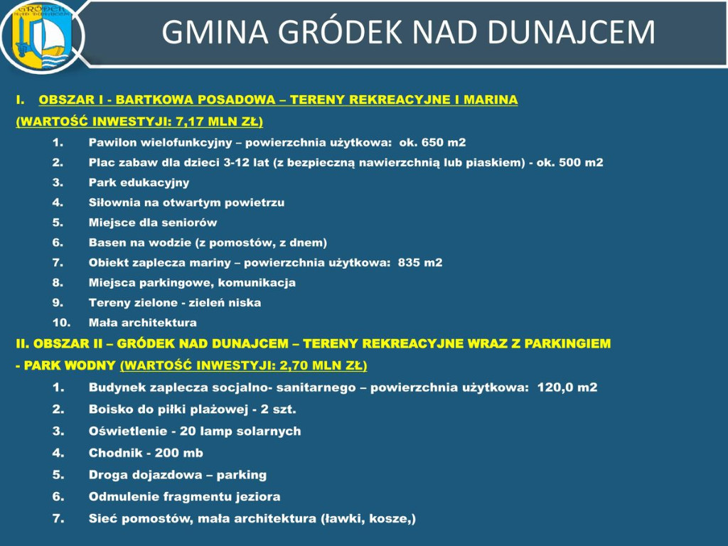Oczekiwania i potrzeby inwestycyjne ukierunkowane na rozwój turystyki w naszej gminie są bardzo duże i docelowo pracami należy objąć wszystkie miejscowości naszej gminy, ponieważ każda z nich ma niezwykły potencjał turystyczny. Niemniej jednak od czegoś trzeba zacząć, dlatego w pierwszej kolejności mają zostać zagospodarowane tereny w Bartkowej-Posadowej (tzw. „ziemie odzyskane” po rekultywacji brzegów jeziora) oraz w Gródku nad Dunajcem. Pierwotnie planowano objąć pracami projektowymi również tzw. cypel w centrum Gródka nad Dunajcem, ale uzyskanie prawa do dysponowania tym terenem na cele budowlane nie byłoby możliwe przed zakończeniem realizacji projektu z uwagi na obowiązujące umowy dzierżawy z prywatnymi podmiotami. Alternatywnie wskazano więc teren za szkołą w Gródku nad Dunajcem przy drodze wojewódzkiej.