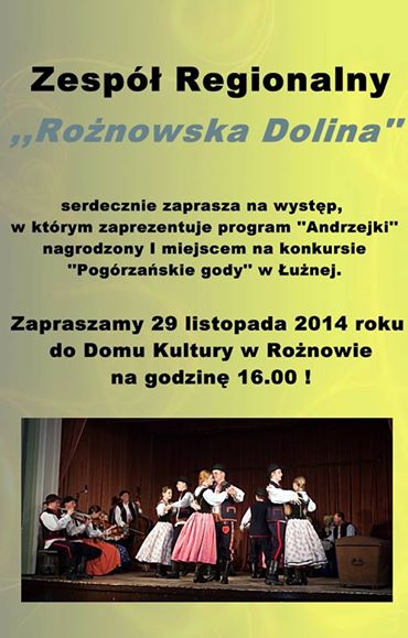 Zespół Regionalny "Rożnowska Dolina" serdecznie zaprasza 29 listopada 2014 roku do Domu Kultury w Rożnowie na godz. 16:00 na występ, w którym zaprezentuje program "Andrzejki"