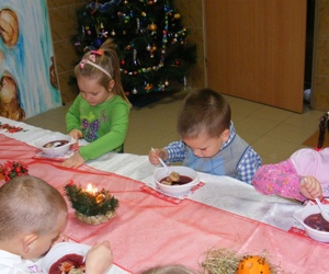 Dnia 23 grudnia 2014 roku w punkcie przedszkolnym „Bajkowa Kraina” odbyło się spotkanie wigilijne. Uroczystość rozpoczęła się od wysłuchania fragmentu z Pisma Świętego i wspólnej modlitwy, a następnie dzieląc się opłatkiem wszyscy goście (przedszkolaki, wychowawczynie i rodzice) złożyli sobie życzenie. Dzieci smakowały barszczyk, własnoręcznie ozdobione pierniki i ciasteczka oraz inne smakołyki. Nie zabrakło również wspólnego śpiewania kolęd i pastorałek. Takie podniosłe chwile nie tylko utrwalają dzieciom znajomość tradycji i zwyczajów świątecznych, lecz również, co najważniejsze, wzmacniają bliskie i serdeczne relacje.