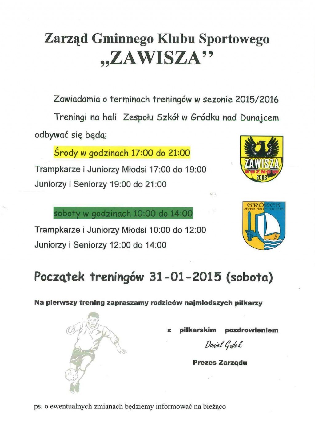 3 stycznia 2015r. Walne Zgromadzenie Stowarzyszenia Gminny Klub Sportowy ZAWISZA powołało nowy Zarząd. Nowym Prezesem największego klubu sportowego w naszej gminie został Daniel Gądek. Nowy Zarząd od razu ostro zabrał się do pracy i już zaprasza na pierwsze treningi. Poszukiwani są również trenerzy chętni do współpracy z klubem.