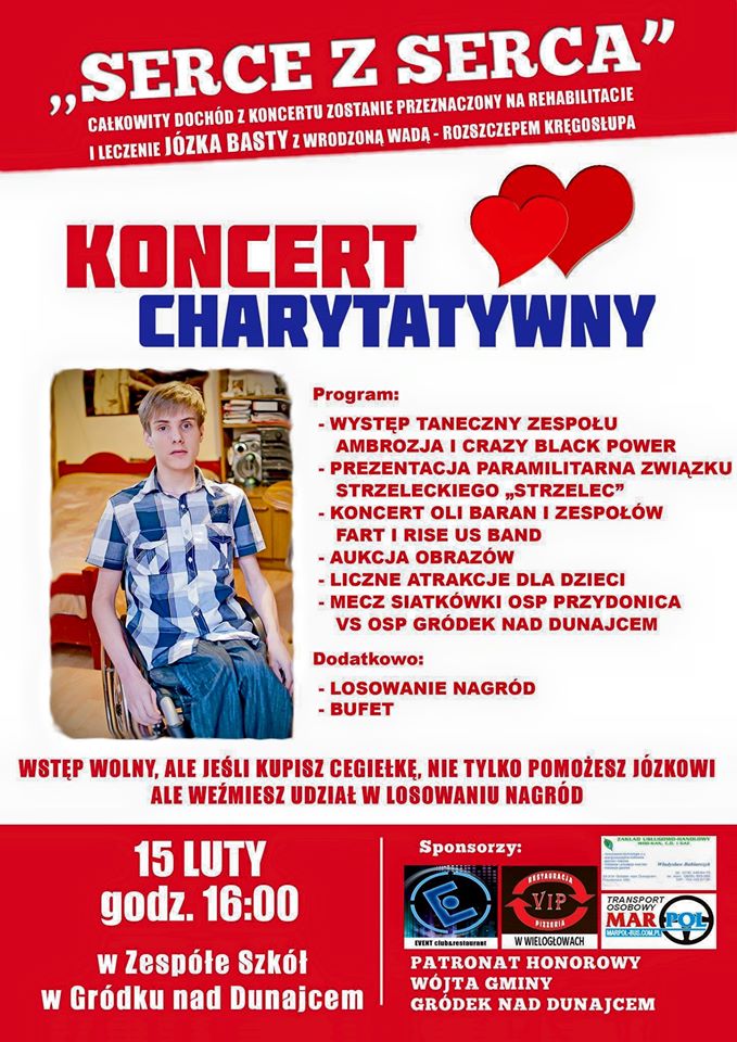 Zapraszamy na koncert charytatywny "SERCE Z SERCA". - 15 LUTEGO W ZESPOLE SZKÓŁ W GRÓDKU NA DUNAJCEM. Całkowity dochód z koncertu zostanie przeznaczony na rehabilitację i leczenie JÓZKA BASTY z wrodzoną wadą - rozszczepem kręgosłupa.Patronat honorowy nad imprezą objął Wójt Gminy Józef Tobiasz.