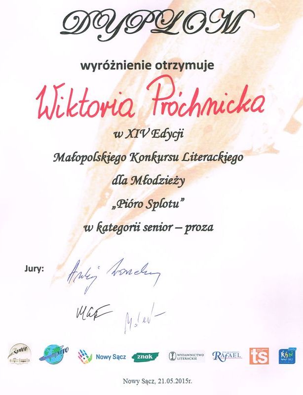 Wiktoria Próchnicka - uczennica Gimnazjum w Podolu-Górowej - znana z sukcesów wokalnych równie dobrze radzi sobie w konkursach literackich. Jurorzy XIV edycji Małopolskiego Konkursu Literackiego dla Młodzieży „Pióro Splotu” docenili talent Wiktorii i przyznali jej drugie miejsce w kategorii senior – poezja i wyróżnienie w kategorii senior – proza.