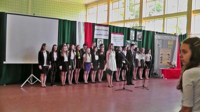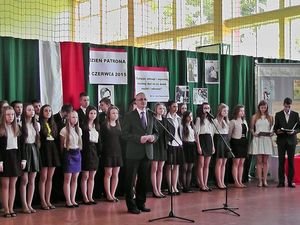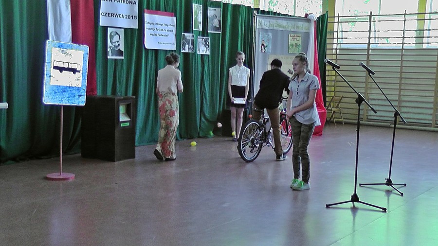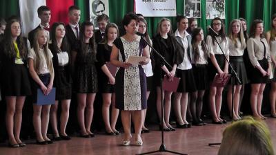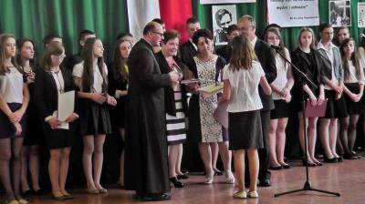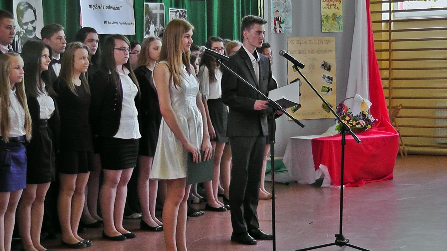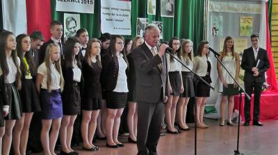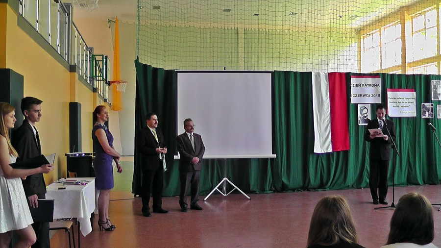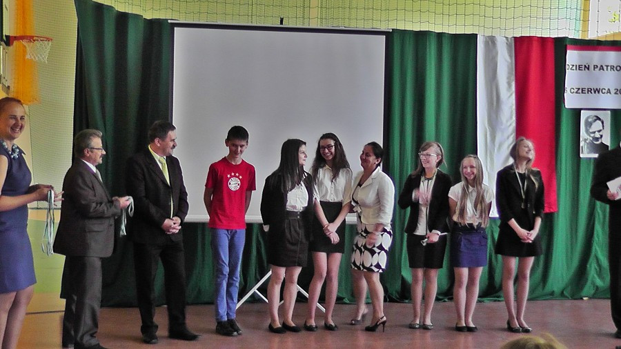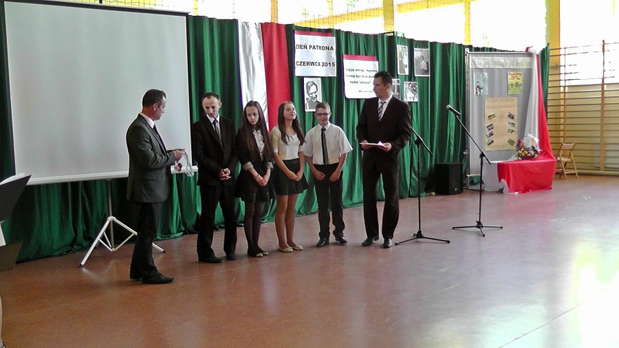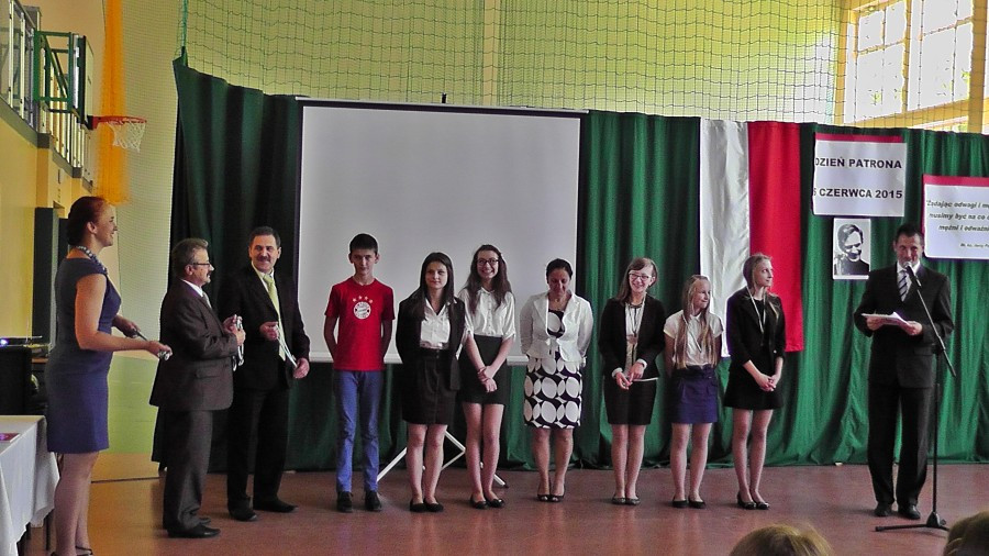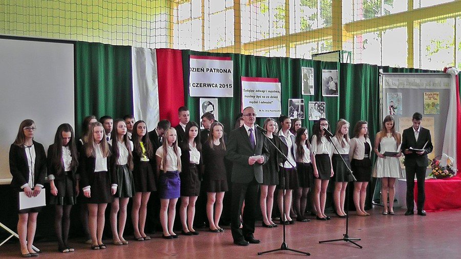 Impreza szkolna rozpoczęła się od przemówień Pana Dyrektora Zespołu Szkół – Ryszarda Baziaka oraz Wójta Gminy – Józefa Tobiasza. W trakcie akademii społeczność szkolna, rodzice oraz zaproszeni goście obejrzeli krótkie scenki przygotowane przez klasy gimnazjalne w ramach konkursu poświęconego patronowi. Uczniowie sami napisali scenariusze, przygotowali dekoracje i w końcu zaprezentowali się na scenie. Prezentacje zostały nagrodzone gromkimi brawami, a ponieważ gimnazjaliści z tego trudnego zadania wywiązali się naprawdę wspaniale, jury przyznało wszystkim zespołom równorzędne I miejsce i nagrodziło zwycięzców słodkimi upominkami.