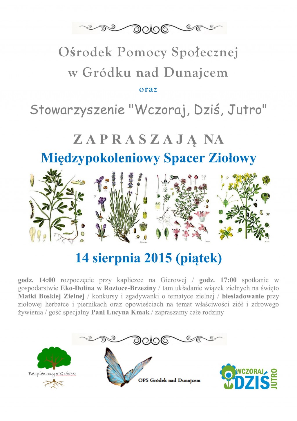 Ośrodek Pomoc Społecznej w Gródku nad Dunajcem oraz Stowarzyszenie "Wczoraj, Dziś, Jutro" zapraszają na "Międzypokoleniowy Spacer Ziołowy". W planie m. in. układanie wiązek zielnych, biesiadowanie przy ziołowej herbatce i piernikach. Początek spotkania 14 sierpnia 2015r. od godz. 14:00 przy kapliczce na Gierowej...