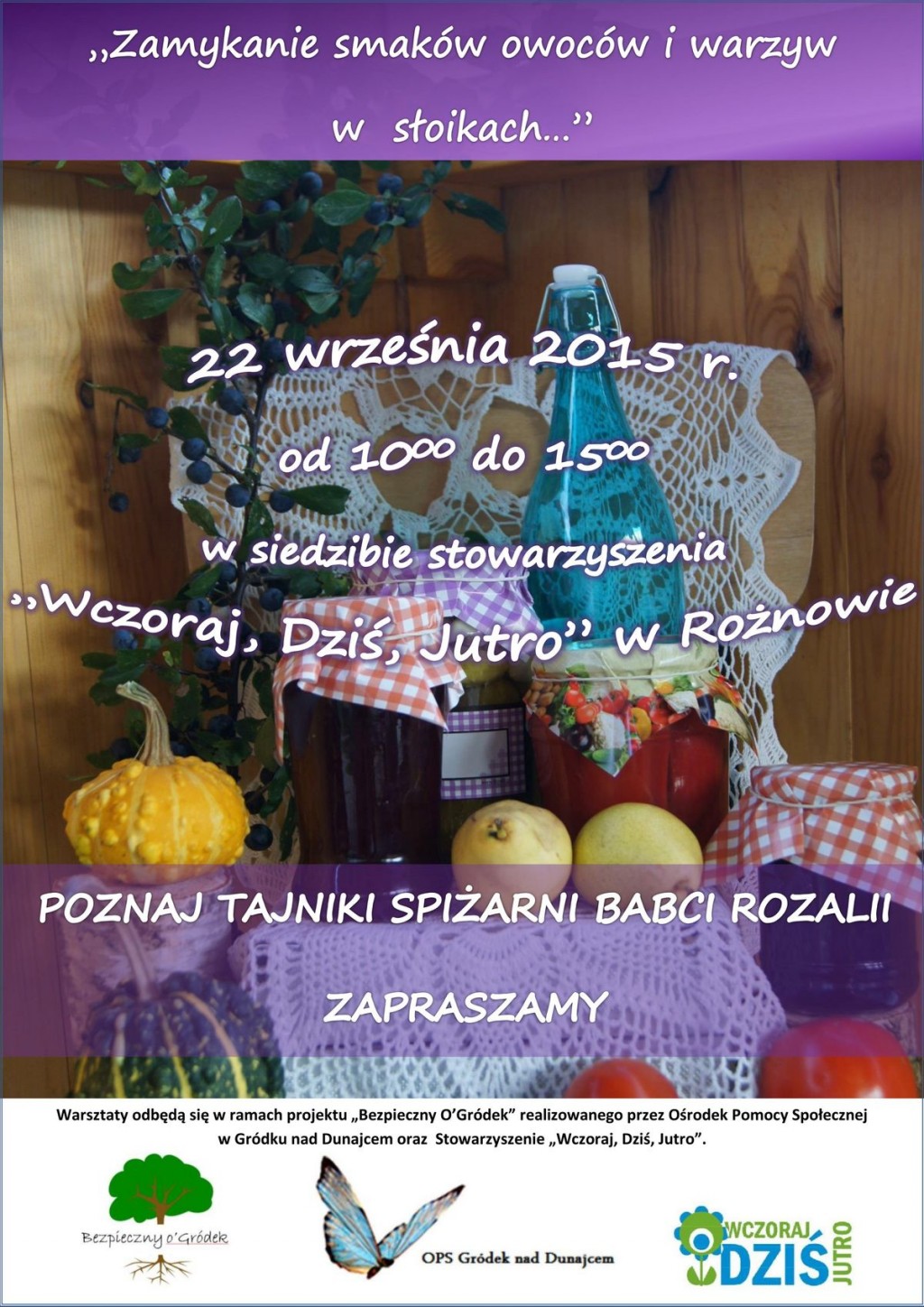 Stowarzyszenie "Wczoraj, Dziś, Jutro" zaprasza na kolejne warsztaty w ramach projektu "Bezpieczny O`Gródek". Tym razem spotkamy się w "Spiżarni Babci Rozalii". Co kryje się pod tą tajemniczą nazwą? Przekonajcie się sami już 22 września 2015r. w siedzibie Stowarzyszenia w Rożnowie. Początek warsztatów o godz. 10:00. Zapraszamy!