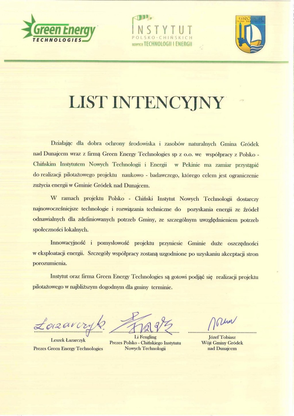 W ubiegłym tygodniu w naszej gminie gościli przedstawiciele Polsko-Chińskiego Instytutu Nowych Technologii i Energii oraz Spółki Green Energy Technologies. Podczas spotkania z władzami naszej gminy został podpisany list intencyjny rozpoczynający trójstronną współpracę nad projektem naukowo-badawczym, którego celem jest ograniczenie zużycia energii w Gminie Gródek nad Dunajcem. Dokument został podpisany przez Wójta Gminy – Józefa Tobiasza, prof. Li Fengling - Prezesa Polsko - Chińskiego Instytutu Nowych Technologii, oraz Leszka Łazarczyka - Prezesa Green Energy Technologies.