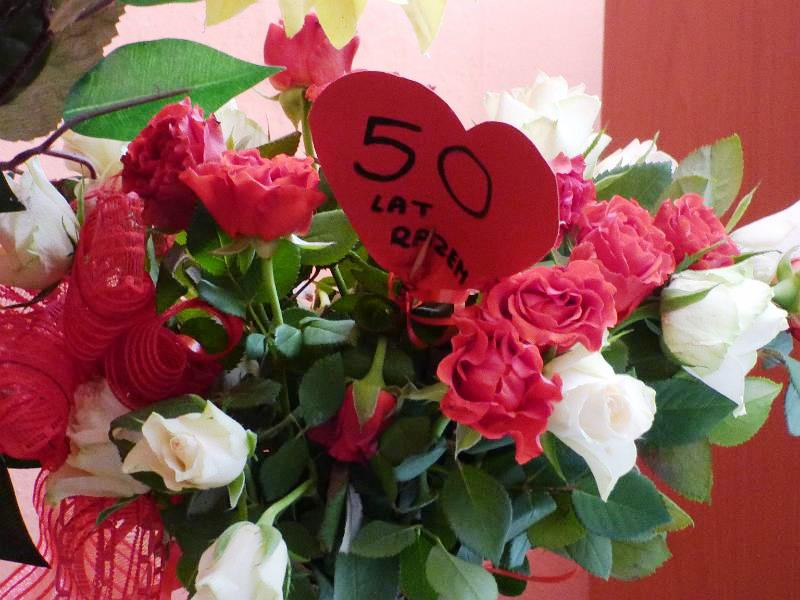"Zacnym Jubilatom z okazji 50-lecia pożycia małżeńskiego składamy najserdeczniejsze gratulacje oraz życzenia zdrowia, pomyślności i szczęścia na dalsze lata wspólnego życia"