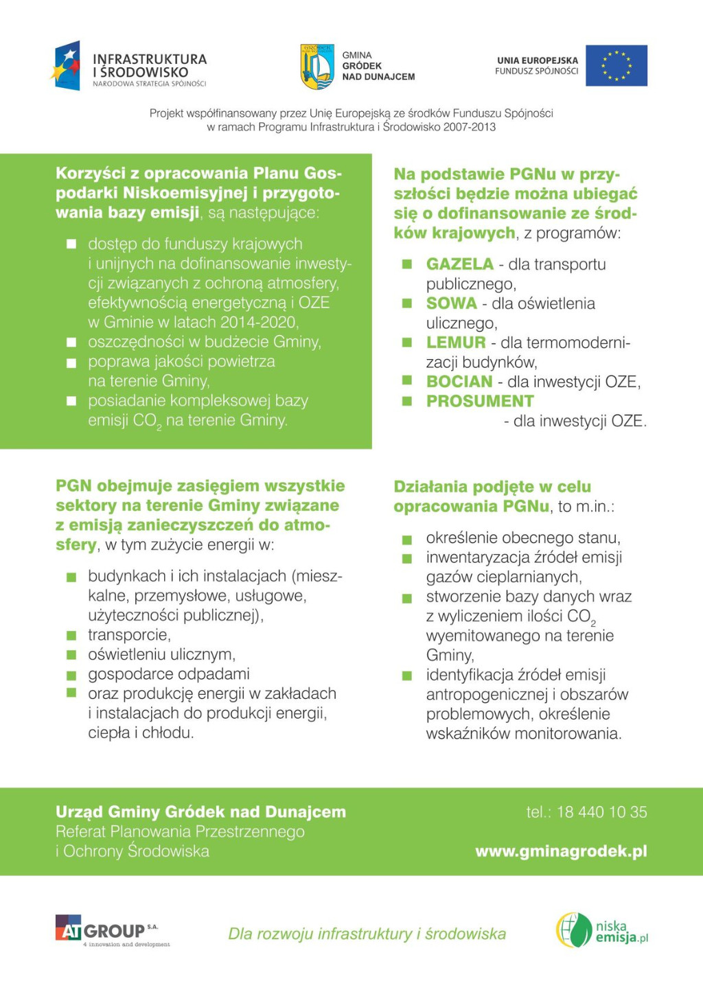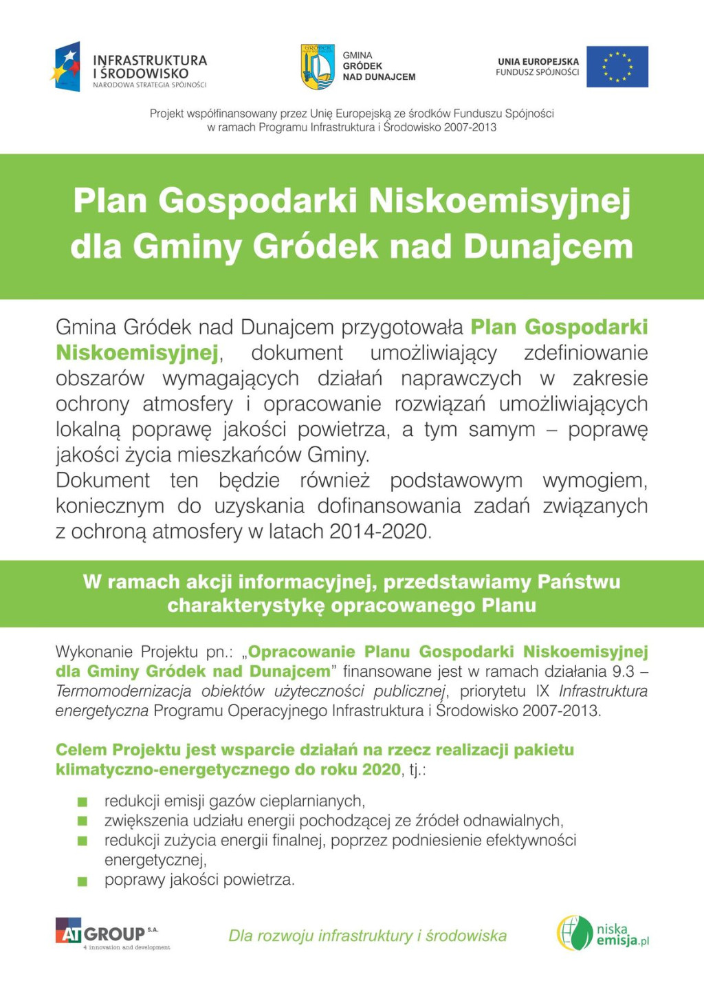 Dokumenty planistyczne z zakresu gospodarki niskoemisyjnej zostały opracowane w ramach projektu pn.: "OPRACOWANIE PLANU GOSPODARKI NISKOEMISYJNEJ DLA GMINY GRÓDEK NAD DUNAJCEM", współfinansowanego ze środków Unii Europejskiej - działanie 9.3. - Termomodernizacja obiektów użyteczności publicznej, priorytetu IX Infrastruktura energetyczna Programu Operacyjnego Infrastruktura i Środowisko 2007-2013.