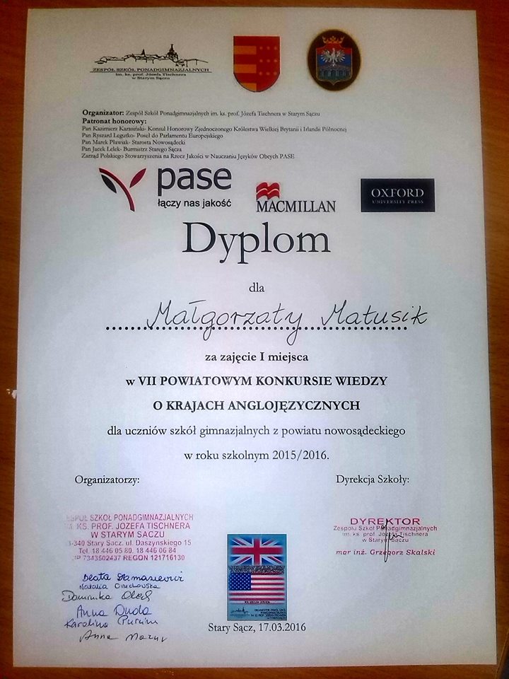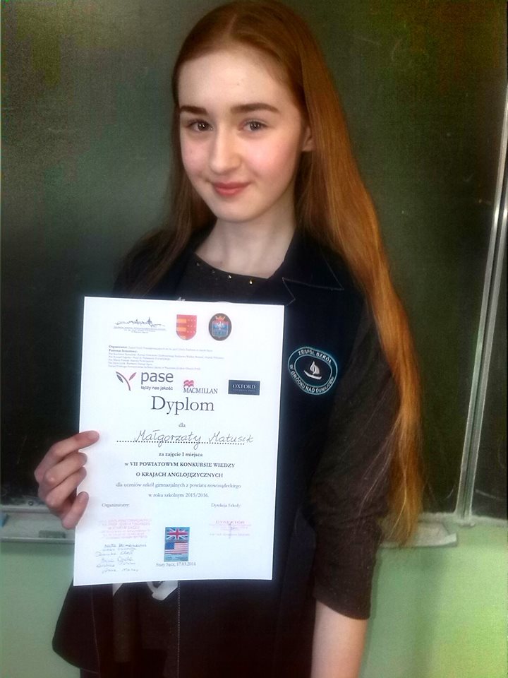Pozostali uczniowie z Gródka nad Dunajcem – Urszula Bajorek, Aleksandra Oleksy i Bartosz Gawlak także wykazali się bardzo dobrą znajomością krajów anglojęzycznych i zostali wyróżnieni! W konkursie wzięła też udział Hanna Osika. Gimnazjalistów do konkursu przygotowywała anglistka p. Magdalena Wolak.