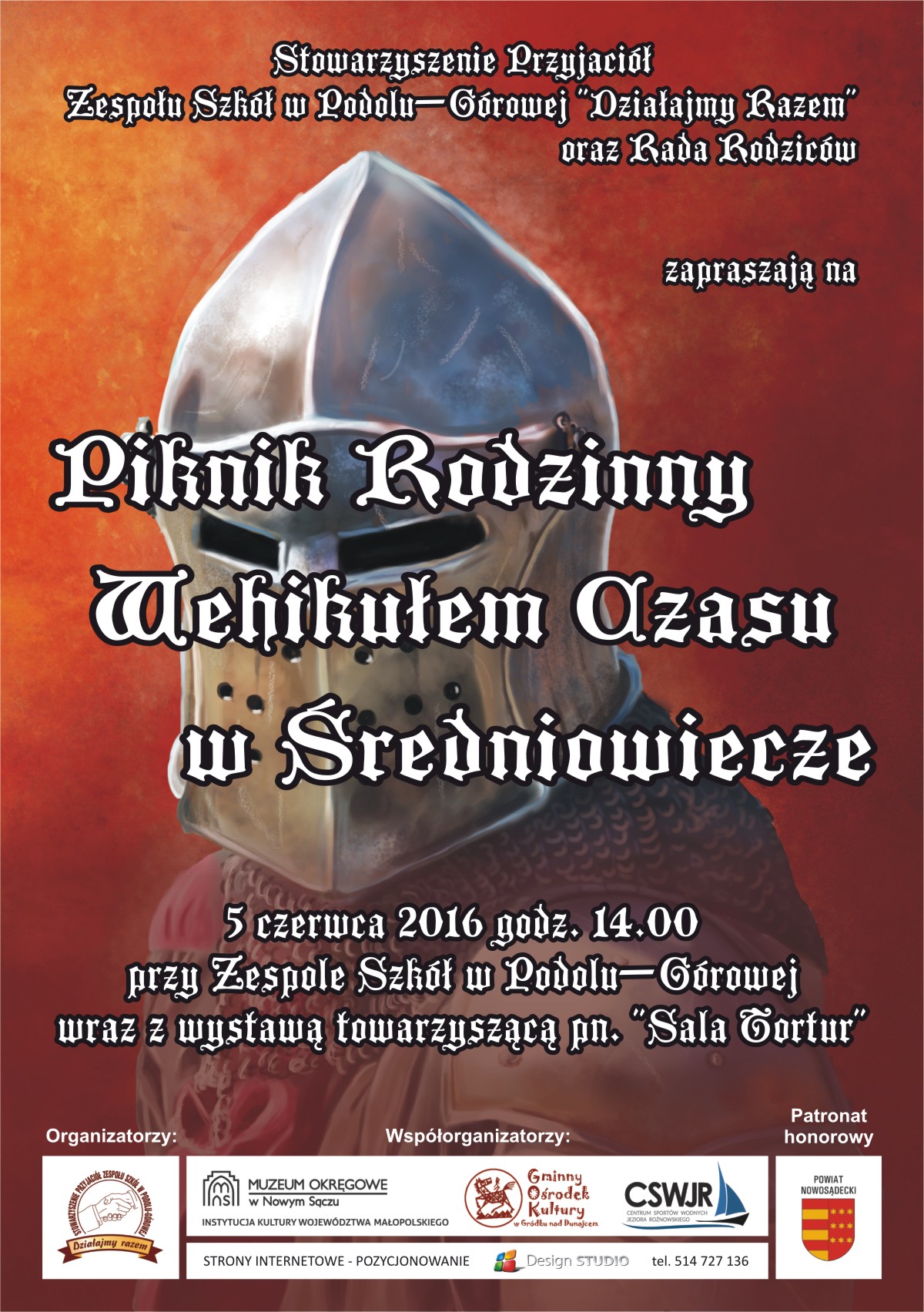 Stowarzyszenie Przyjaciół Zespołu Szkół w Podolu-Górowej "Działajmy razem" oraz Rada Rodziców zapraszają na Piknik Rodzinny "Wehikułem Czasu w Średniowiecze". Impreza odbędzie się 5 czerwca 2016r. o godz. 14:00 przy Zespole Szkół w Podolu-Górowej. W programie m. in. prezentacja tańców oraz strojów z epoki Średniowiecza, a także pokaz walk rycerskich i wystawa... SALA TORTUR...Zapraszamy!