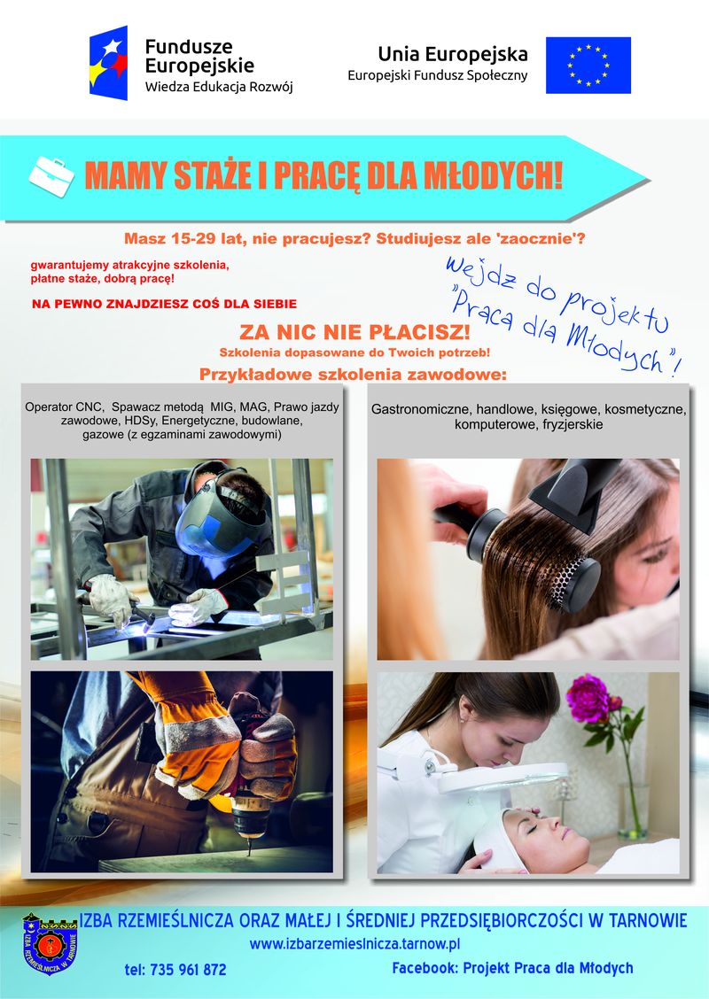 Izba Rzemieślnicza oraz Małej i Średniej Przedsiębiorczości w Tarnowie, rozpoczęła realizację projektu „Praca dla Młodych”. Celem projektu jest poprawa sytuacji ludzi młodych na rynku pracy ( 15-29 lat tzw. młodzież NEET), poprzez aktywizację społeczną i zawodową. W ramach Projektu organizujemy szkolenia zawodowe dostosowane indywidualnie do potrzeb każdego Uczestnika oraz płatne staże (szkolenia kończą się egzaminami dającymi uprawnienia do wykonywania zawodu np. operator CNC, operator koparki, wózka widłowego).