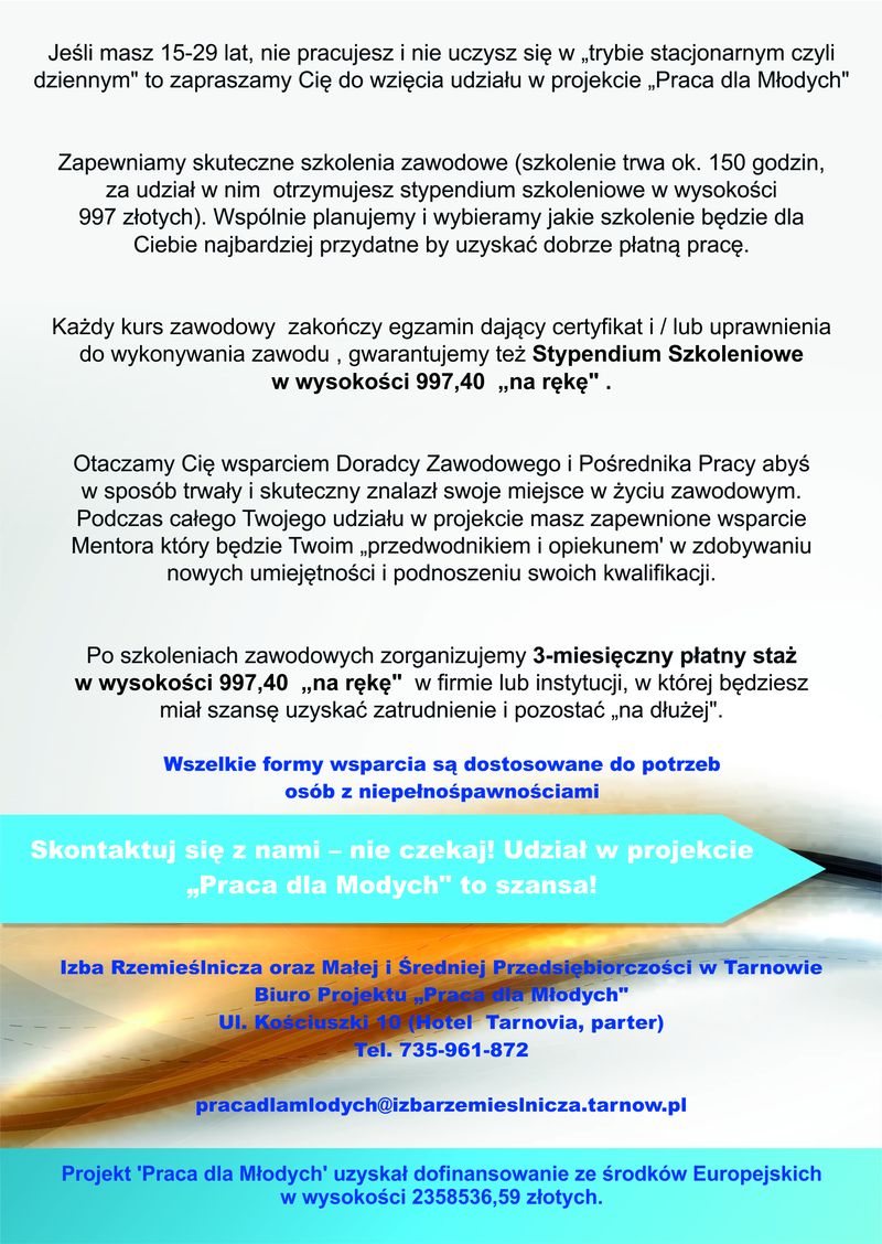 Zachęcamy do zapoznania się ze szczegółami projektu na stronie: http://izbarzemieslnicza.tarnow.pl/projekty-europejskie/praca-dla-mlodych