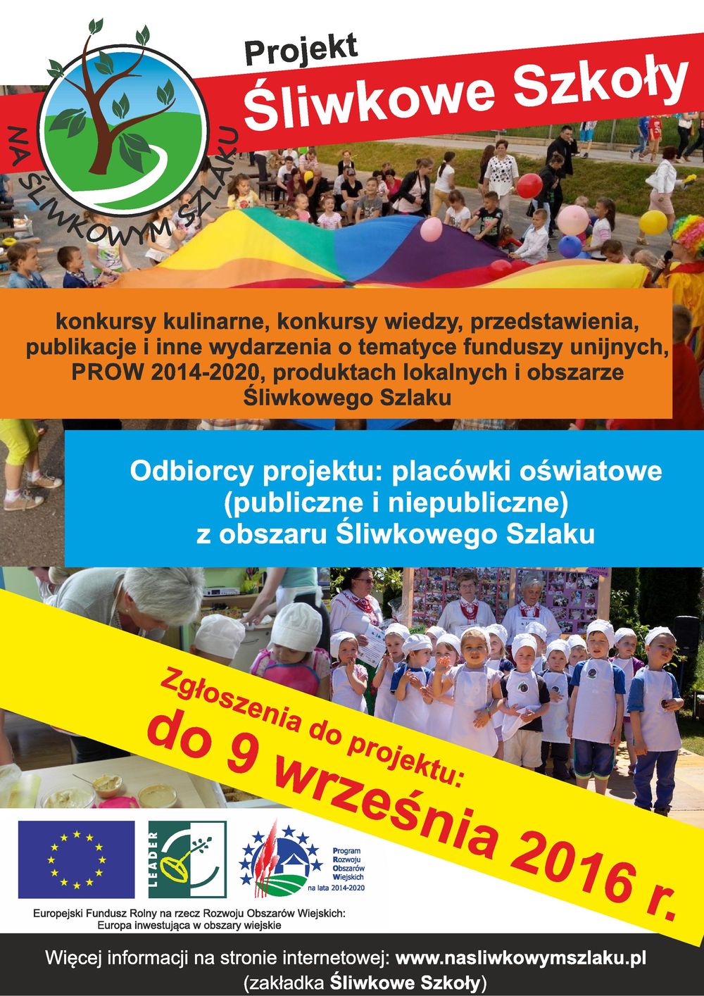 Stowarzyszenie „Na  Śliwkowym Szlaku” zaprasza placówki oświatowe publiczne i niepubliczne (przedszkola, szkoły podstawowe, gimnazja, szkoły średnie) z terenu Śliwkowego Szlaku (gminy: Czchów, Gnojnik, Gródek nad Dunajcem, Iwkowa, Korzenna, Lipnica Murowana oraz Łososina Dolna) do udziału w projekcie „Śliwkowe Szkoły”. Celem projektu jest wzrost zaangażowania mieszkańców w podejmowane przez LGD działania, w tym partnerskie projekty współpracy lokalnej oraz zwiększenie wiedzy o funduszach unijnych, PROW 2014-2020 oraz Stowarzyszeniu „Na Śliwkowym Szlaku”. Prosimy o zgłaszanie propozycji przedsięwzięć (realizowanych w okresie wrzesień – listopad 2016), w których elementem dominującym będą tematy związane z obszarem Śliwkowego Szlaku, produktami lokalnymi oraz funduszami unijnymi np.: (konkursy kulinarne, konkursy wiedzy, przedstawienia, publikacje i inne). Zgłoszone do dofinansowania przedsięwzięcie musi być odrębnym wydarzeniem w stosunku do wcześniej realizowanych działań przez daną placówkę oświatową .
