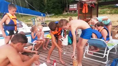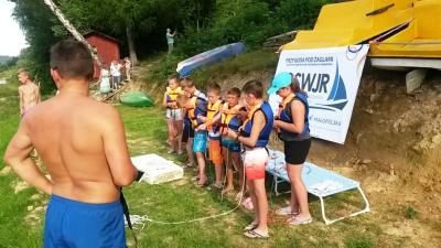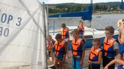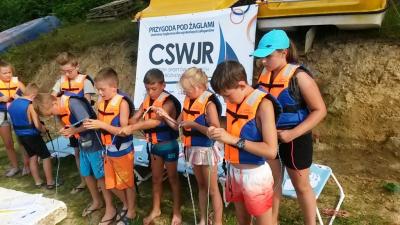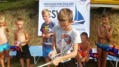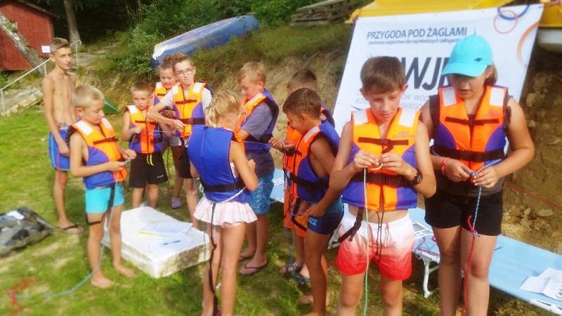 Młodzi przyszli żeglarze szybko opanowali sztukę wiązania węzłów, poznali też jak prawidłowo zapiąć kamizelkę asekuracyjną oraz obserwowali jak przygotować optymistkę tj. mały jachcik dla dzieci do zajęć praktycznych, czyli nauki żeglugi. Dowiedziały się do czego służy wimpel i jak rozpoznać kierunek wiatru, jak bezpiecznie podchodzić i odchodzić żaglówką z pomostu, jak ustawiać łódkę i żagiel do wiatru aby płynąć w żądanym kierunku oraz jak dbać o sprzęt żeglarski.