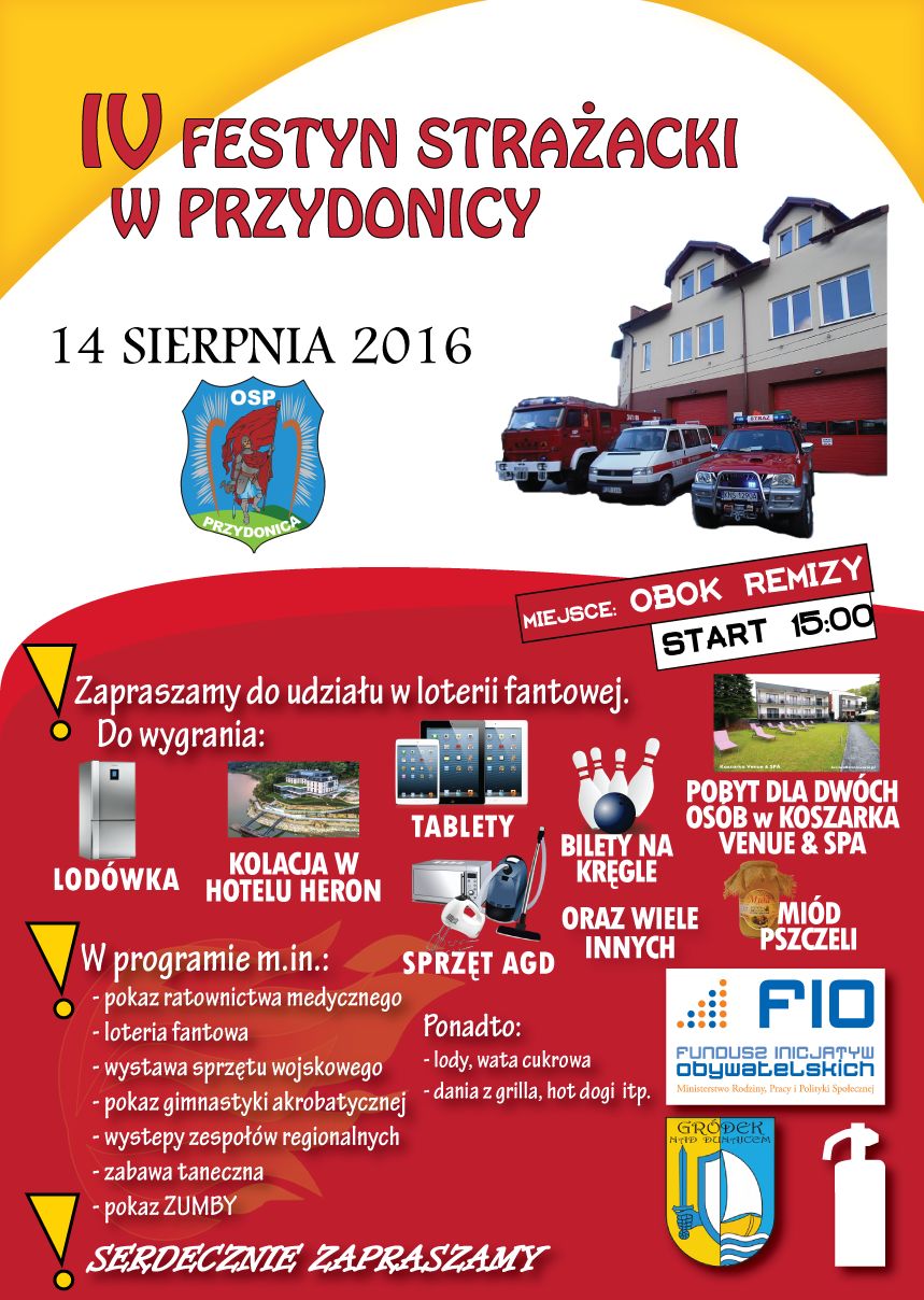 Zapraszamy na IV Festyn Strażacki w Przydonicy, który odbędzie się 14 sierpnia 2016r. obok remizy OSP. W programie jak zwykle wiele atrakcji: pokaż sprzętu strażackiego, stoisko militarne, stoisko edukacyjne ratownictwa medycznego, loteria, konkursy, zabawa taneczna i wiele innych.... start imprezy o godzinie 15:00.