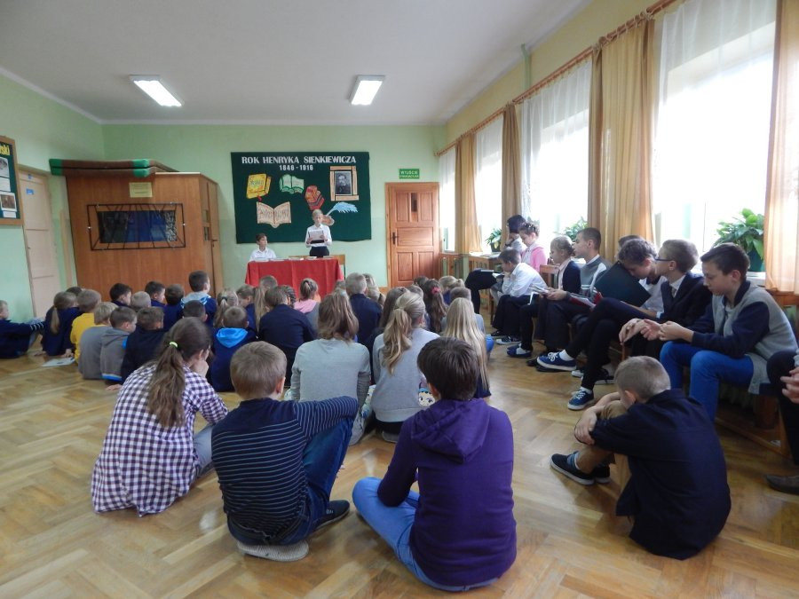 24 października odbyło się czytanie książki „W pustyni i w puszczy”. Uczniowie z klas IV – VI zaprezentowali słuchaczom piękne interpretacje głosowe fragmentów powieści polskiego noblisty. Jako pierwsza w świat przygód Stasia i Nel zabrała uczniów pani mgr Barbara Maciaszek – opiekunka szkolnej biblioteki. Całość prowadziła polonistka, pani mgr Anna Fecko. Dzieci z zaciekawieniem słuchały, jak zakończy się historia porwania sympatycznych bohaterów.