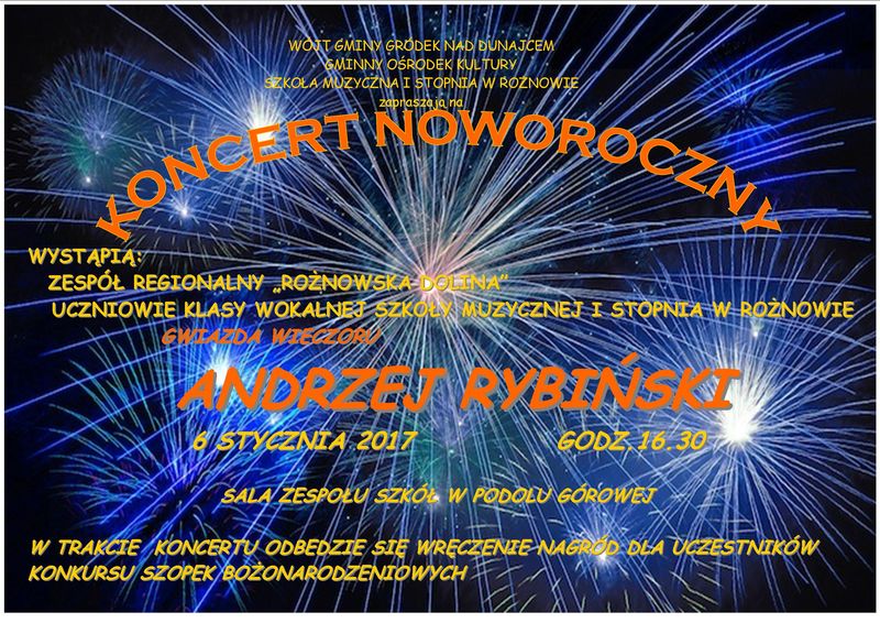 Serdecznie zapraszamy na Koncert Noworoczny, który odbędzie się 6 stycznia 2017r. o godz. 16:30 w Zespole Szkół w Podolu-Górowej. Kolędować dla nas będą uczniowie klasy wokalnej Szkoły Muzycznej w Rożnowie, Zespół Regionalny "Rożnowska Dolina" oraz gwiazda wieczoru czyli Andrzej Rybiński.