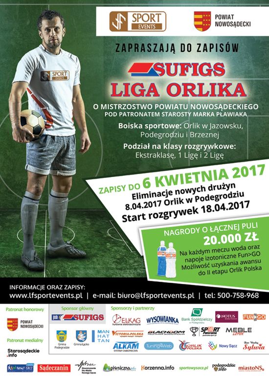 Ruszają zapisy do rywalizacji w ramach Sufigs Ligi Orlika o Mistrzostwo Powiatu Nowosądeckiego. Pula nagród 20 tys. złotych! Zainteresowani uczestnictwem w rozgrywkach powinni zgłosić swoją drużynę do 6 kwietnia 2017.Patronat honorowy nad imprezą sprawuje Starostwo Powiatowe w Nowym Sączu.