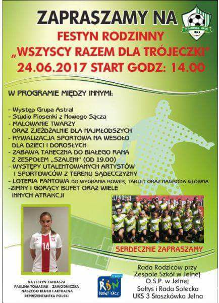 Już w najbliższą sobotę, 24 czerwca, zapraszamy wszystkich do Jelnej na festyn rodzinny pod hasłem: "Wszyscy Razem dla Trójeczki". Początek imprezy o godzinie 14:00 przy remizie OSP w Jelnej. W programie wiele atrakcji, w tym loteria, występy artystów i sportowców, gry i zabawy dla dzieci, a na koniec oczywiście zabawa taneczna do białego rana...