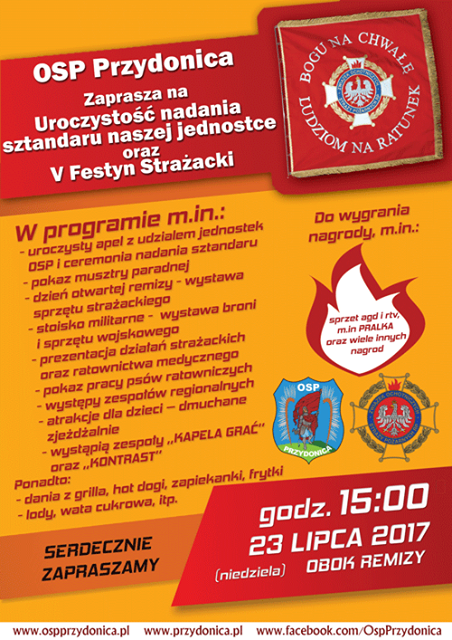 Ochotnicza Straż Pożarna w Przydonicy zaprasza na uroczystość nadania jednostce sztandaru oraz V Festyn Strażacki. Początek uroczystości o godzinie 15:00 w najbliższą niedzielę 23 lipca br. obok remizy w Przydonicy. W programie oprócz części oficjalnej przygotowano wiele atrakcji - pokazy, prezentacje, występy zespołów regionalnych i muzycznych. ZAPRASZAMY!