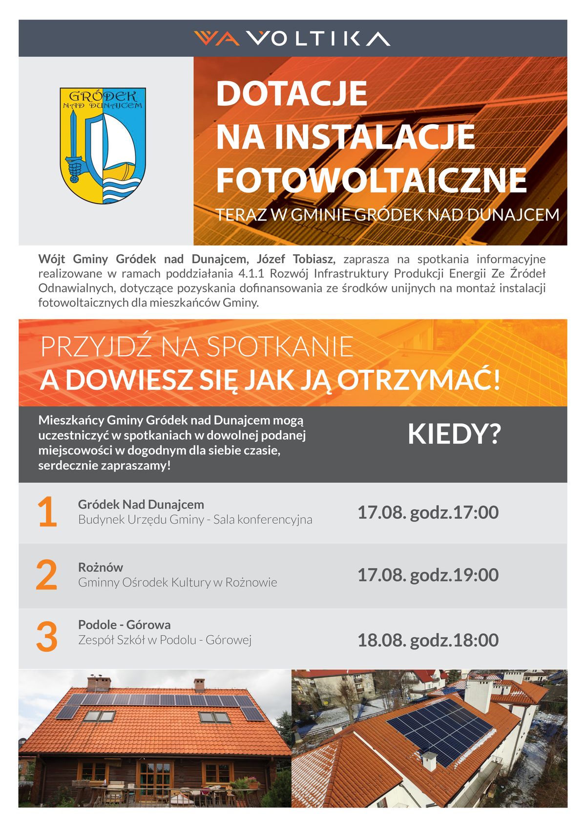 17 i 18 sierpnia br. w Gródku nad Dunajcem. Rożnowie oraz Podolu-Górowej odbędą się spotkania informacyjne na temat możliwości dofinansowania ze środki Unii Europejskiej montażu m.in. instalacji fotowoltaicznych.