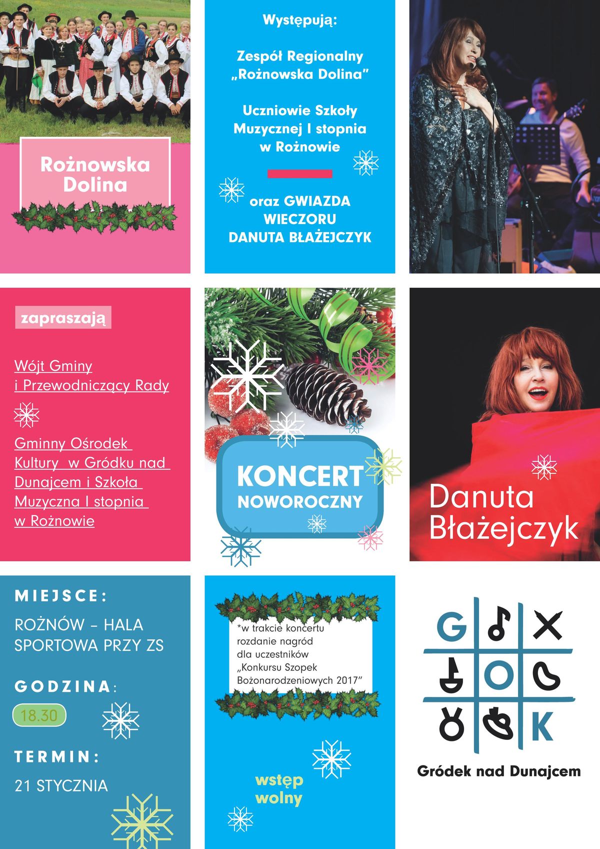 W niedzielę 21 stycznia br. zapraszamy wszystkich do Rożnowa na halę sportową na "Koncert Noworoczny". Ciekawy repertuar zaprezentuje "Zespół Regionalny Rożnowska Dolina", Uczniowie Szkoły Muzycznej I stopnia w Rożnowie oraz gwiazda wieczoru... Danuta Błażejczyk. Początek koncertu o godz. 18:30. Zapraszamy!