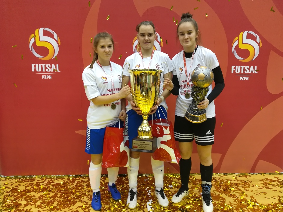 Piłkarki z UKS 3 Staszkówka Jelna nie przestają zachwycać. Ze stadionów piłkarskich dziewczyny przeniosły się na halę sportową. Paulina Tomasiak, Anna Bałuszyńska i Sandra Różycka wypożyczone na jeden turniej do Wandy Kraków wywalczyły w Tychach złote medale Młodzieżowych Mistrzostw Polski w futsalu (do lat 18). Nasze reprezentantki nie tylko mocno wsparły zespół ze stolicy Małopolskie, ale same zdobyły indywidualne wyróżnienia... najlepszego strzelca i najlepszej bramkarki turnieju... Gratulujemy!