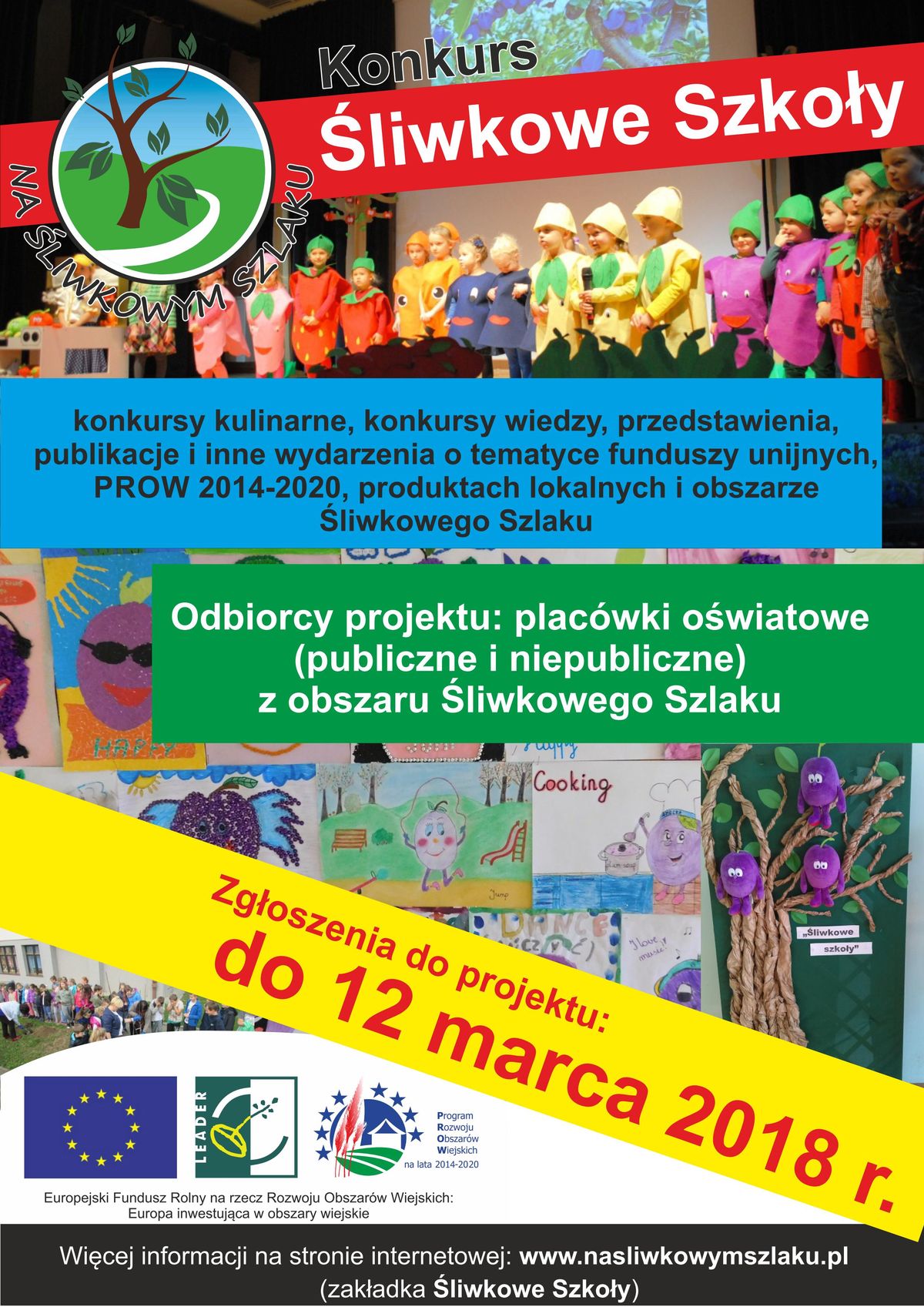 Celem projektu jest wzrost zaangażowania mieszkańców w podejmowane przez LGD działania, w tym partnerskie projekty współpracy lokalnej oraz zwiększenie wiedzy o funduszach unijnych, PROW 2014-2020 oraz Stowarzyszeniu „Na Śliwkowym Szlaku”. Prosimy o zgłaszanie propozycji przedsięwzięć (realizowanych w okresie kwiecień – czerwiec 2018 r.), w których elementem dominującym będą tematy związane z obszarem Śliwkowego Szlaku, produktami lokalnymi oraz funduszami unijnymi np.: (konkursy kulinarne, konkursy wiedzy, przedstawienia, publikacje i inne).