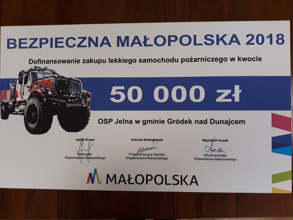 Gmina Gródek nad Dunajcem otrzymała dotację w wysokości 50 000 zł od Samorządu Województwa Małopolskiego na zakup samochodu pożarniczego dla OSP Jelna. W miniony piątek - 3 sierpnia 2018 roku w sali konferencyjnej Muzeum Lotnictwa Polskiego w Krakowie nastąpiło oficjalne przekazanie umów dotacji w ramach konkursu „Bezpieczna Małopolska 2018”.