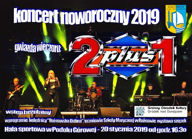Wójt Gminy Gródek nad Dunajcem wraz z Gminnym Ośrodkiem Kultury zapraszają do udziału w Koncercie Noworocznym, który odbędzie się 20 stycznia 2019 roku o godzinie 16.30 na hali sportowej w Podolu - Górowej. Gwiazdą wieczoru będzie zespół 2+1...
