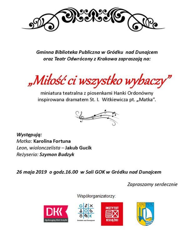 Gminna Biblioteka Publiczna w Gródku nad Dunajcem oraz Teatr Odwrócony w Krakowie zapraszają na miniaturę teatralną pt. "Miłość ci wszystko wybaczy"
