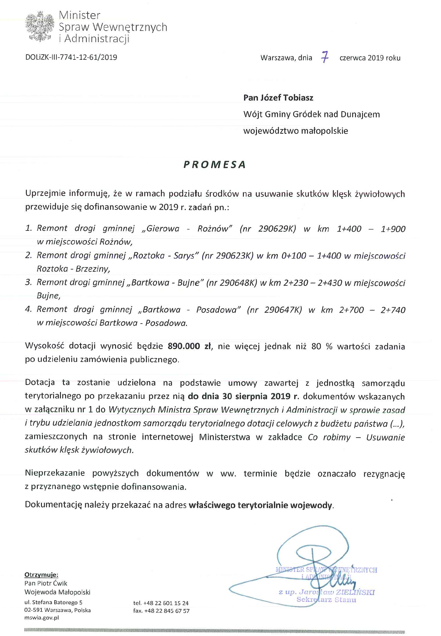 W dniu wczorajszym Gmina Gródek nad Dunajcem otrzymała kolejną już promesę na dofinansowanie remontów dróg. Promesa opiewająca na kwotę 890 tyś. zł dotacji dotyczy remontu dróg uszkodzonych przez powódź. Kwota dofinansowania stanowi maksymalnie 80% wartości zadania.