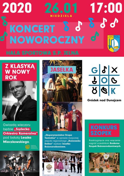 Podczas Koncertu w oprawie muzycznej zespołu regionalnego „Rożnowska Dolina” wystawione zostaną Jasełka Bożonarodzeniowe. Na scenie wystąpią między innymi przedstawiciele władz samorządowych, nauczyciele, pracownicy Urzędu Gminy, Gminnego Ośrodka Kultury, Gminnej Biblioteki Publicznej i Spółki "Dunajec". W trakcie koncertu nastąpi również rozstrzygnięcie oraz wręczenie nagród uczestnikom Konkursu Szopek Bożonarodzeniowych.