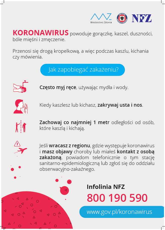 Narodowy Fundusz Zdrowia zachęca do zapoznania się z informacją na temat koronawirusa. Szczegóły w załączeniu oraz pod poniżej podanymi linkami: